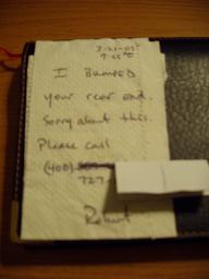 Note: 3-21-05 9:45am I bumped your rear end, sorry about this, please call -408-727-xxxx Robert