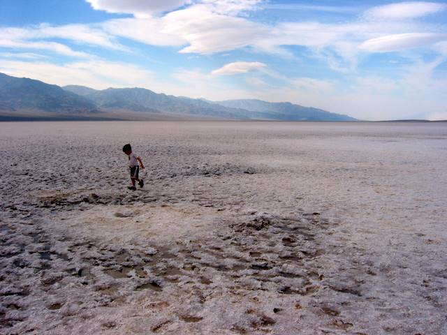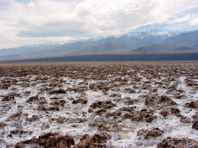 北美洲海拔最低点就在这里,在公园内一个叫做“恶水”(Badwater)的地方。凡是来死谷的人,必定去恶水看看。这是一个海拔负二百八十二英尺的盆地,一眼望去白茫茫平整整的一片,在阳光下很刺眼。很容易误以为是大型的滑冰场,或者雪地。可是,都不是,是盐!从来没见过这么多的盐。从地面到地下几尺深都是结晶的盐。随手捻起一点往口里去,咸咸的,味道不错。死谷的谷地中,处处可见这样白茫茫大片大片的盐地。