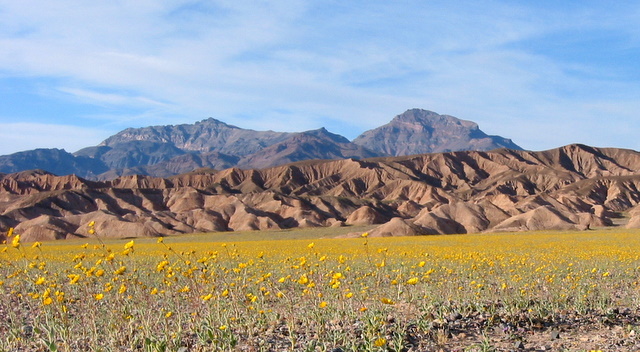事情缘于十九世纪的西部淘金热。1849年,在加州发现了金矿,于是全美国的人都做着黄金梦,不顾艰难,踏上往西的征途。其中一队人马,偏离了早期西班牙人开发出来的已知路径,想探索新捷径进入加州,结果历尽艰难,于当年十二月份来到位于这两个山脉之间的这个谷地。先锋队人眼看着前面是层峦叠嶂的茫茫大山,别提心里有多害怕和泄气。他们早已经很衰弱的牛是断然翻不过这大屏障的。圣诞节前夜,他们在这里杀了几条牛,拆了货车,用拆下的木头烧火,把牛肉制成牛肉干。真可谓破釜沉舟的魄力。就这样带着牛肉干,只身去翻越这面临的层峦叠嶂。最后也得以走出大山,走出沙漠。他们称这个地方为“死谷”,尽管他们在这里并没有死什么人。这个名字就这样流传下来了,于这谷地、于在这里世世代代生活繁衍的印第安人,于这里遍地的野花、活跃的响尾蛇蝎子们,这名字多少是有些不公正的。不过,也只是一个名字而已。