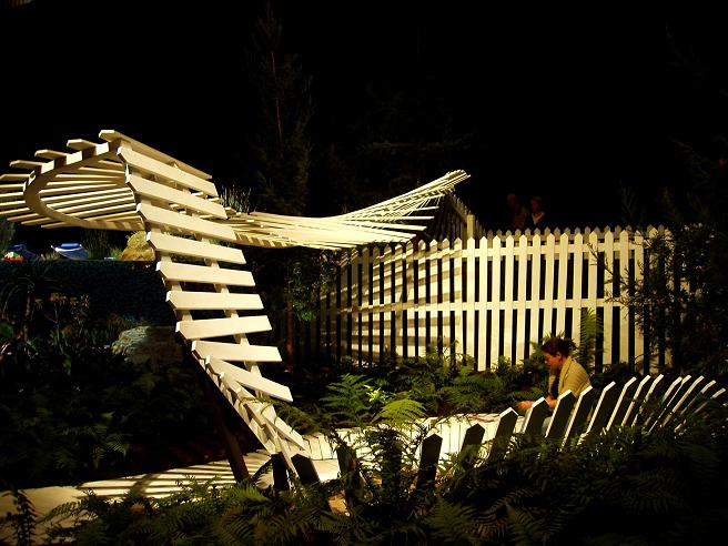 这道不寻常的花园的栏杆( FENCE) 象波浪翻滚 ! the fence undergoes multiple transformations as it traverses the garden, twisting from soaring trellis to welcoming bench to inviting walkway.