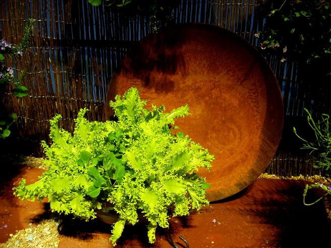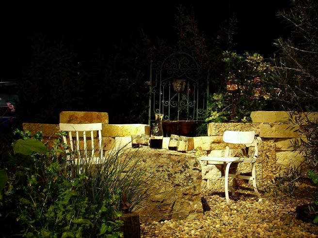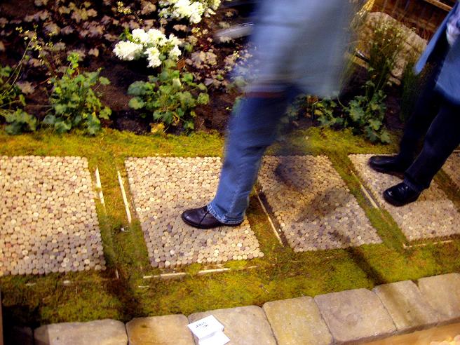 这个花园的全部的材料是从酿酒业回收, 灯是酒瓶做的, 花园的家具是酒桶做的, 花园的曲径竟然是用酒瓶的软木塞铺的, 踩上去非常的松软, 好舒服!