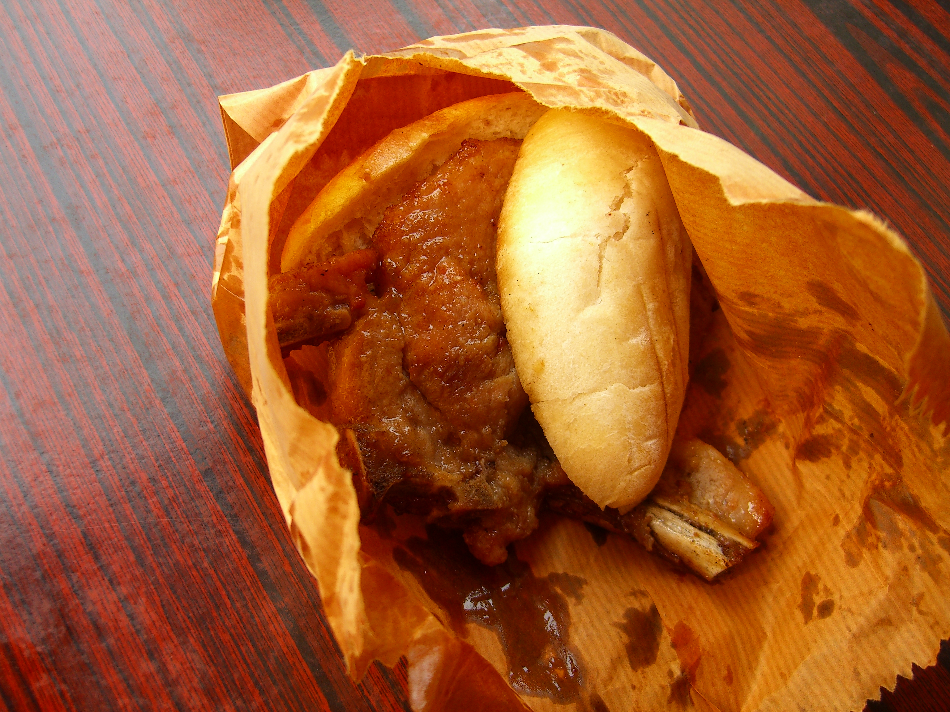 凉棚底下,已经得手的男女食客,左手扯着冰冻丝袜奶茶的吸管,右手举起热辣辣的猪仔包。离远观望:大利来记猪仔包,似是麦fish大细,装在黄色纸袋里面。金黄油渍沁入纸张,远看也亮得晃眼。火热出炉的硬身面包,在柴枝火焰中成熟的带骨猪排,形体上难以妥协,不知碰撞之后怎样交融?