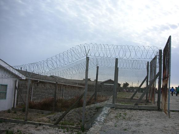 B区牢房的外面是一个由三面高墙围起来的院落,院内粗糙的水泥地面上画着一个网球场,网球场的另一端孤零零地生着两颗苹果树。这里便是犯人们当年放风或从事敲打石块、缝补邮袋等苦役的地方。B区牢房的对面原也有一排牢房,但为了将曼德拉等政治犯彻底隔离,狱方推倒了那排牢房垒起了又一道高墙。或许是为了发泄愤怒,那面约五米高的墙上被人凿得伤痕累累。曼德拉第一次被囚在罗本岛监狱是1962年8月被捕后的一段时间,后作为“第一号被告”被押往比勒陀利亚出庭“利沃尼亚案”审判。1964年6月判处终生监禁后被关押在罗本岛,直至1982年才被移往波尔斯摩尔监狱。曼德拉27年的铁窗生涯中有约19年是在这里度过的。