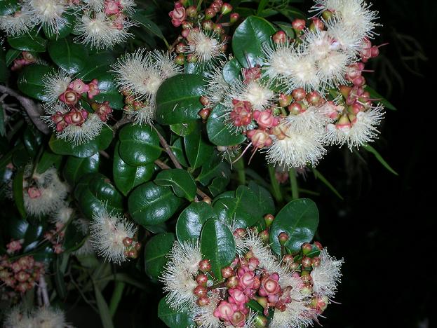 这花看着象桃金娘科的蒲桃(Eugenia sp.),应该是南非的吧,叶很